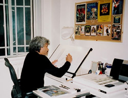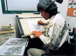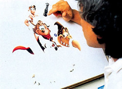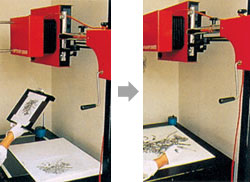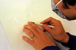 出来上がったスケッチをオプチスコープ(投影機)にかけて主要な線をひろい出す。イラストはオプチスコープ下に置かれたイラストレーションボードに映し出され、 それを鉛筆でなぞるという作業だ。 |