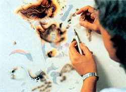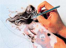 第一段階の作業が終了したイラストレーションボードの全面に、再度マスキングペーパーを貼り付ける。第一段階で仕上げた顔部分にはもう色をのせないのでマスクを覆わせたままにし、それ以外の着彩に取り掛かる。またペーパーを剥がしてはエアブラシを噴き、、、という作業を根気よく繰り返す。 |