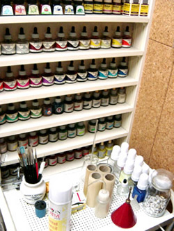 ちなみに今回使用した絵の具はすべてカラーインク。ウィンザー&ニュートン、ペリカン、ヌーベルを多く揃えている。キャンバスボードに描くときなどは、アクリル系の絵の具を使う。 |