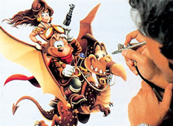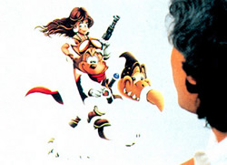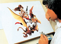 コントラストが弱いところ、もっと強調したいところなどに修正を入れればオーケー。それがすめば、いよいよ完成。ちなみに前作業が終了するまでに要する時間は、まるふつか。構図を決めるのに1日かかるというから、色入れは・・・・・・なんと、1日でできちゃうんだね |